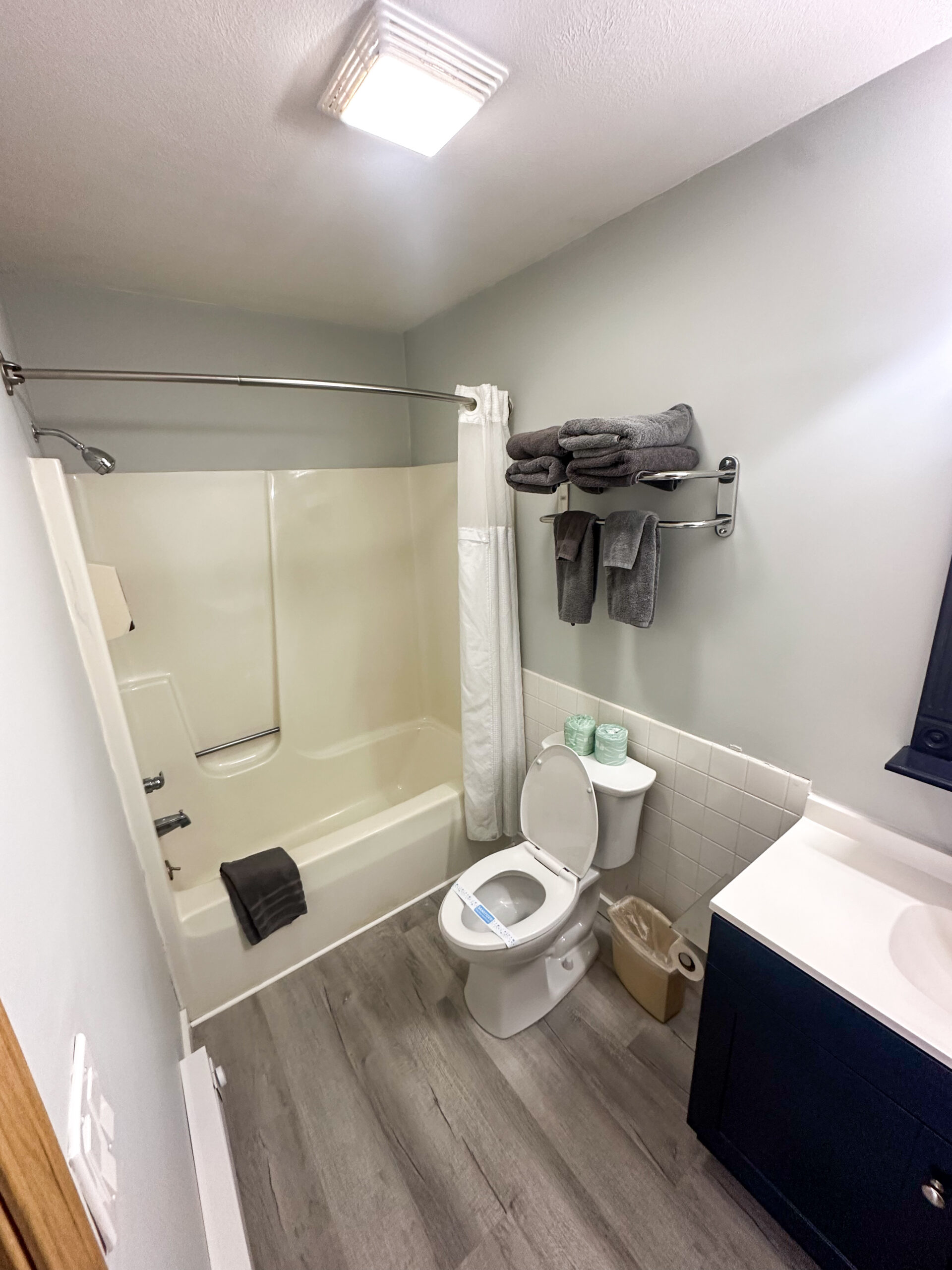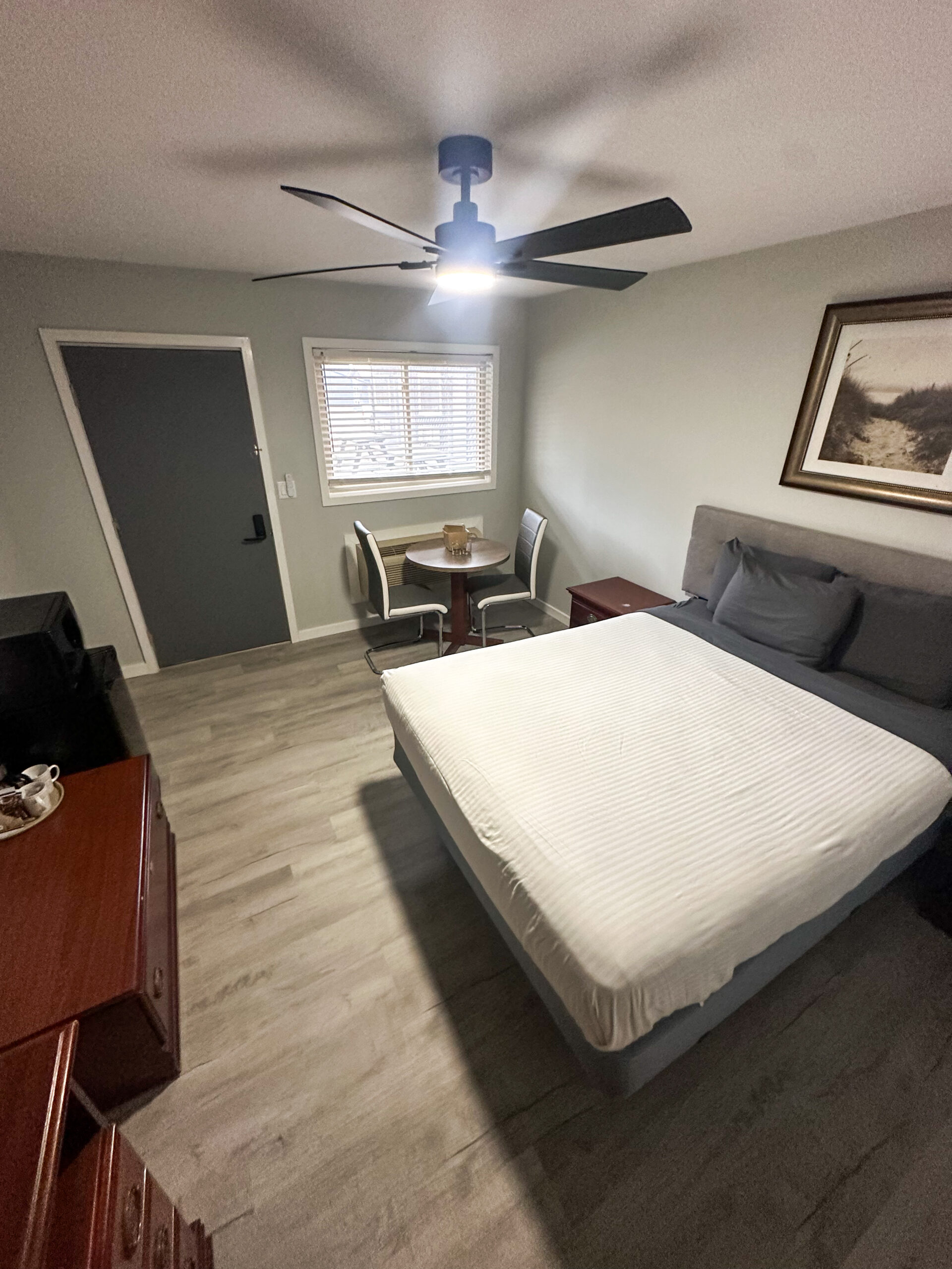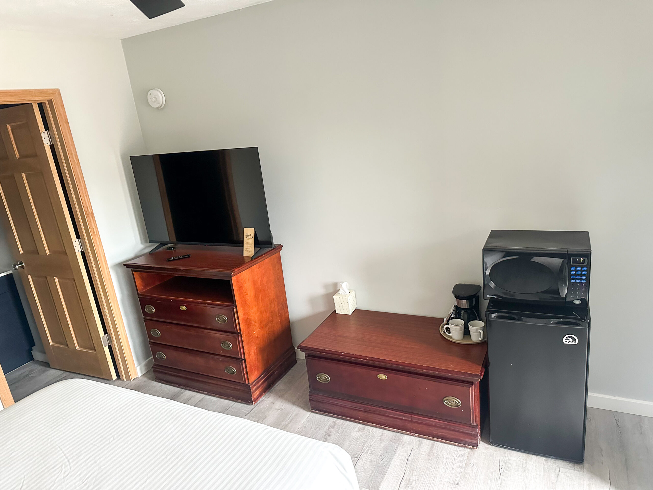 This air conditioned room includes one king bed. It has a microwave, small fridge and television.